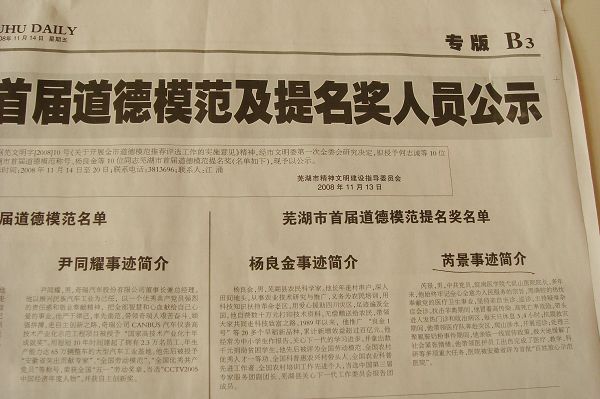 《芜湖日报》于2008年11月14日报道了我校消防活动并对芮景和赵金霞等芜湖市首届道德模范及提名奖人员进行公示。在该报B2版即社会生活版,陈洪、孟鸣两位记者以《消防教官走进高校普及消防知识》为标题,报道了“119”消防宣传活动周期间,弋江区消防大队抽调业务骨干,对我校安全管理人员、大学生护校队员及物业公司负责人进行消防安全培训并现场灭火演练一事。该报B3版以专版的方式对芜湖市首届道德模范及提名奖人员进行公示,我校弋矶山医院院长芮景和护士赵金霞的事迹简介在其中刊登。(宣传部  任苔蓉  文/摄)