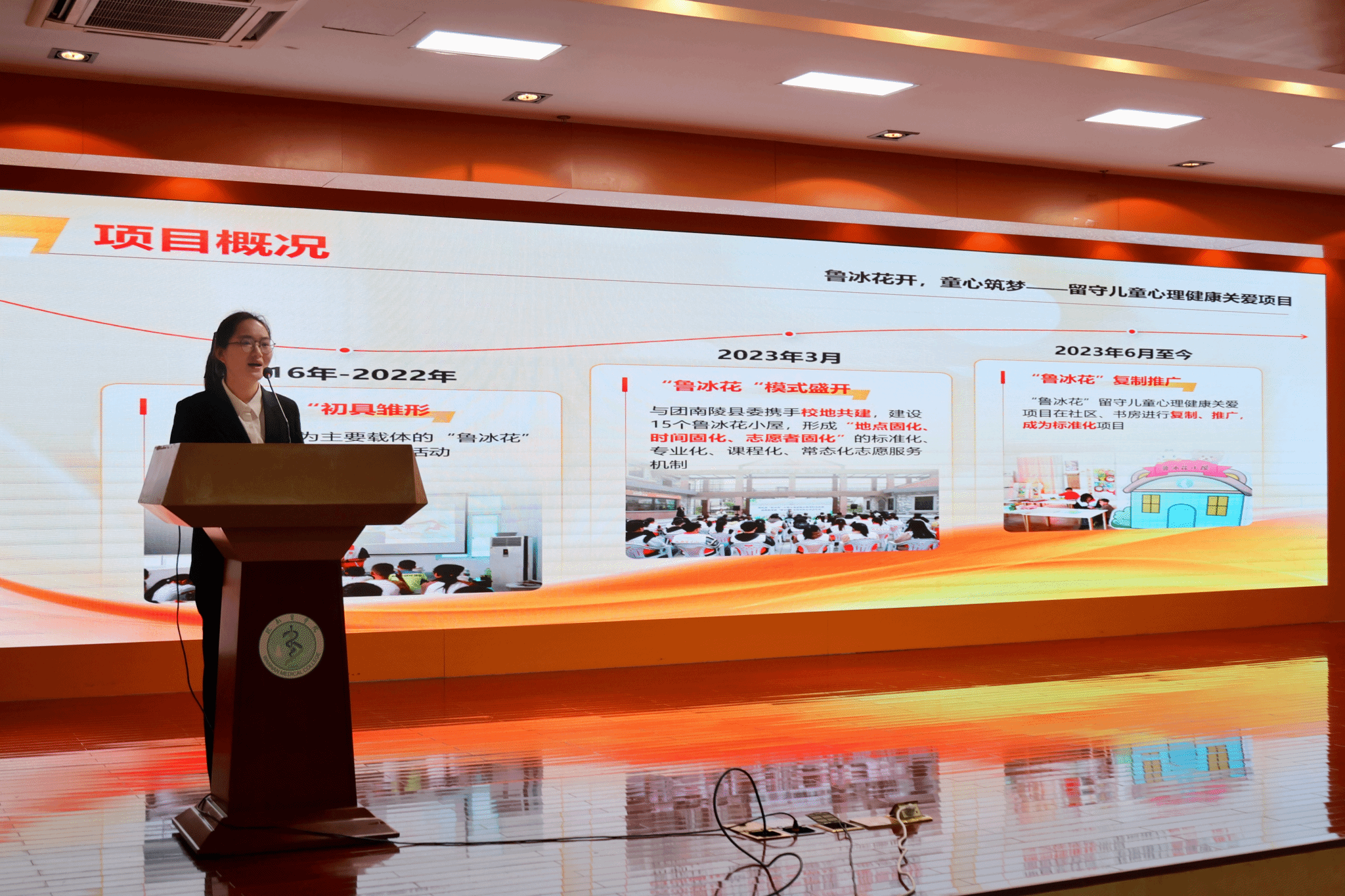 随后,来自第七届中国青年志愿服务项目大赛国赛金奖项目《遗路有爱——遗体捐献公益事业赋能行动》、国赛铜奖项目《鲁冰花开,童心筑梦——留守儿童心理健康关爱项目》以及省赛银奖项目《爱心相髓,为生命续航——造血干细胞科普宣讲暨捐献志愿服务项目》《“Woohoo急救”蓝丝带行动项目》等4个优秀项目的汇报人依次登台分享,从项目设计运维、团队建设、特色亮点、经验成效等方面进行交流展示,为我校青年志愿者进一步开展契合学科专业、彰显学校特色的志愿服务项目提供了可复制、可持续、可推广的经验和做法。