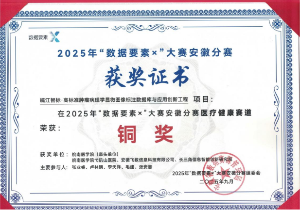 9月20日,2025年世界制造业大会-数据要素综合试验区创新成果暨新模式新场景对接会在合肥召开。国家发展改革委党组成员、国家数据局党组书记、局长刘烈宏,安徽省人民政府副省长李中出席会议并致辞。会议同期举行了2025年“数据要素×”大赛安徽分赛颁奖仪式、创新成果发布、项目路演及集中签约等活动。由我校牵头申报的《皖江智标·高标准肿瘤病理学显微图像标注数据库与应用创新工程》项目(以下简称“皖江智标项目”)在医疗健康赛道50余支参赛队伍中脱颖而出,以第6名的成绩获安徽省铜奖。