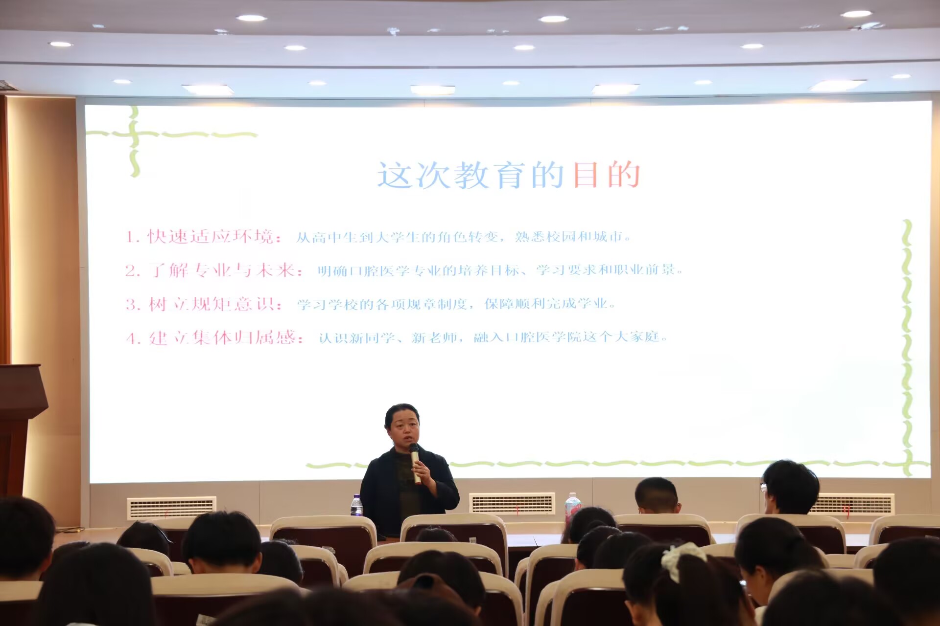 为帮助2025级新生尽快融入大学生活,明确未来职业发展方向,牢固树立规矩意识,近日,口腔医学院在学院五楼会议室开展2025级口腔医学、口腔医学技术专业新生入学教育。学院党委书记柴琳、院长邓超、党委副书记张晋艳、新生辅导员吴义红及2025级全体新生参加会议。