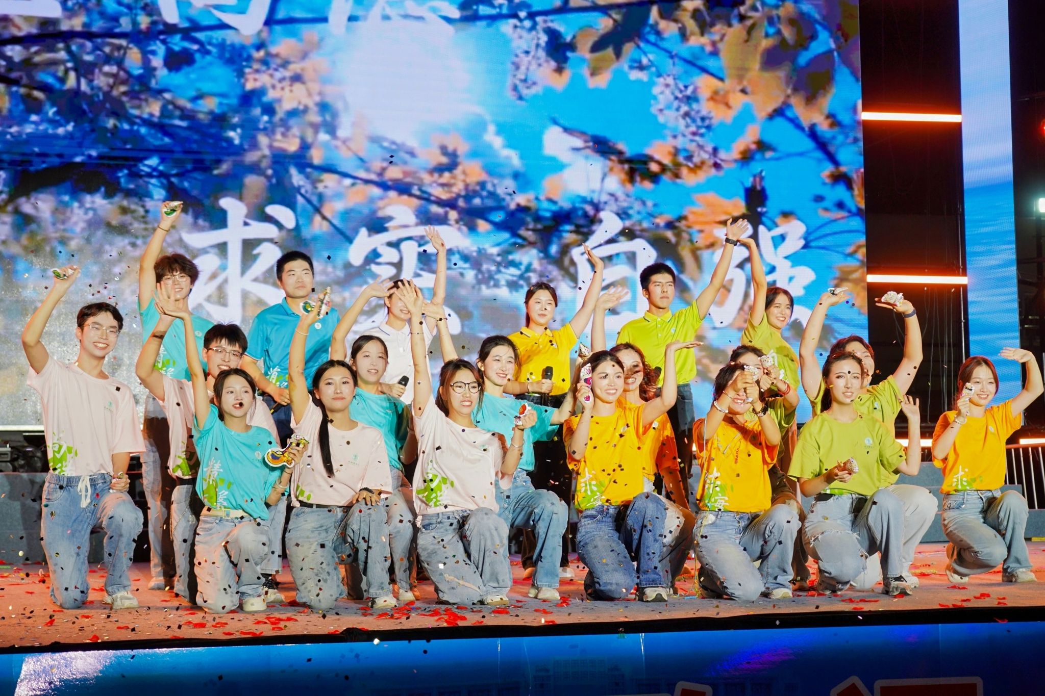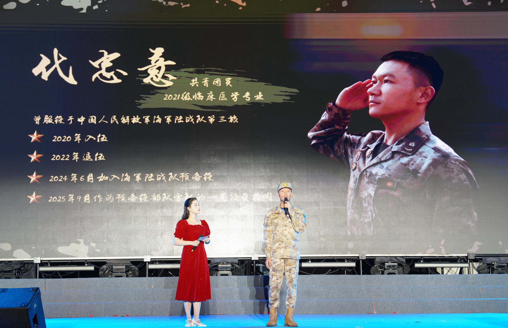 晚会在恢弘大气的开场龙鼓《旌旗半卷战九霄》中拉开帷幕;器乐合奏《就是哪吒》展现传统文化和当代精神的激情碰撞,传递“打破束缚、勇往直前”的青春无畏;军事爱好者协会带来的队列表演《钢铁洪流》刚劲有力,英姿勃发、气贯长虹,让人回想起抗战胜利80周年阅兵时的震撼场景;参加九三阅兵的两名在校退役大学生代忠意、张允乔现场分享他们通过层层选拔、经历刻苦训练,最终走到天安门阅兵现场的心路历程,一句“脚下的安宁是先辈热血换来的”让全场掌声雷动,经久不息;新生辅导员代表唱响纪念中国人民抗日战争暨世界反法西斯战争胜利80周年主题歌曲《铭记》,追忆烽火岁月,致敬伟大抗战精神,点燃在场师生心底的家国情怀,引发强烈共鸣;舞蹈《山河图》展现祖国大好河山,以今天的繁华盛世回应英雄先烈,书写这封跨越时空的家书;中外学生歌曲联唱《如是》唱出了青年人坚守初心、拼搏奋进的意气风发和追光而行,初心如炬的坚定昂扬。