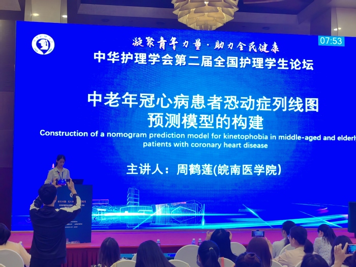 在全国护理学生论坛上,2021级护理专业硕士研究生周鹤莲同学作题为《中老年冠心病患者恐动症列线图预测模型的构建》的学术分享,受到与会专家学者的一致好评。2020级本科生杨雨婷作题为《安徽省社区老年人成功老龄化现状及影响因素分析》的大会交流;2020级本科生陶自健作题为《极速老龄化进程下本科护生从事老年照护工作的知信行调查》的壁报交流。
