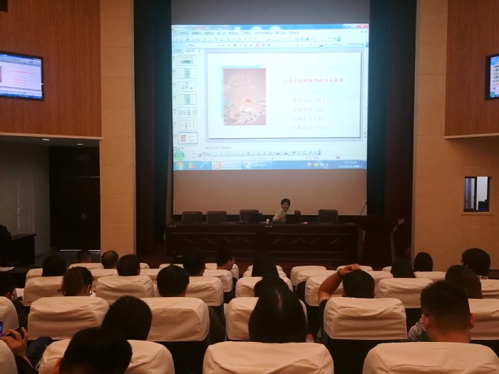 为加强师德师风建设,迎接新中国成立70周年,2019年6月26日下午2:00,公共基础学院邀请安徽师范大学文学院周元琳教授在逸夫楼一楼报告厅举办了优秀传统文化与师德师风报告会。本次报告会由公共基础学院党总支副书记何爱民主持,院长杜少陵及学院全体教职员工聆听了报告。