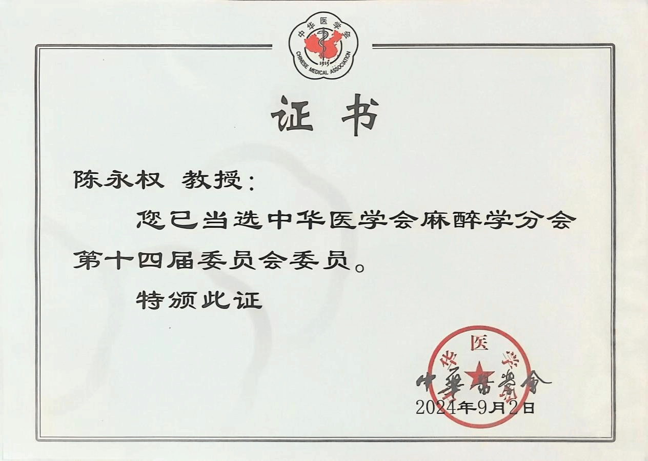 第一附属医院麻醉科主任陈永权当选中华医学会麻醉学分会第十四届委员会委员