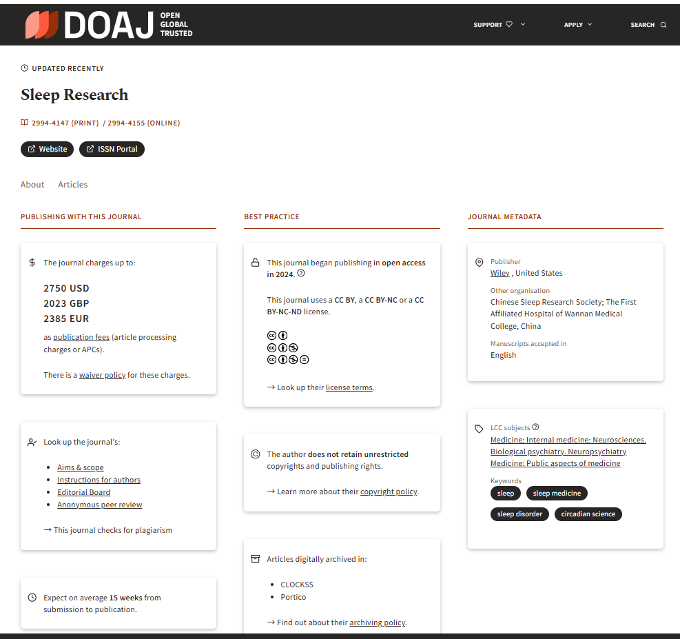 《Sleep Research》在DOAJ数据库中的期刊主页